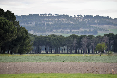 A short stretch of country road took us up a small rise, where we got a clear view of the large white stucco and red brick Siete Iglesias hermitage. Shortly afterwards we descended to a small treed park with picnic tables and information signage on the banks of the Adajo River. We stopped for a break and a snack, hanging out with the half dozen park employees who were also enjoying a smoke break in the park before returning to their work of tree planting.
