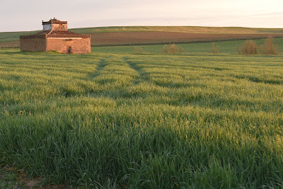 We followed the winding red dirt trail out into rolling fields of brown, green, and yellow. The slanting golden rays of the rising sun were illuminating the young green crops and creating curving shadows across the rolling hills. The sky was a clear blue, the air was cool and still, and the only sounds were those of birds singing. Looking back we could see Villalon de Campos behind us. It was a beautiful morning.